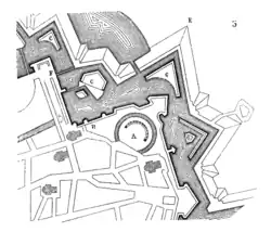 - ↑ Codification des attaques des places fortes par Vauban. Trois tranchées parallèles reliées entre elles par des tranchées de communication en zigzag pour éviter les tirs en enfilade. La première parallèle est une place d'arme hors portée de tir des défenseurs permettant de résister à un assaut à revers, la deuxième contient l'artillerie, la troisième les sapeurs et les troupes d'assaut, enfin le cavalier de tranchée situé à l'angle mort à la pointe du bastion ennemi est une élévation permettant de surplomber les défenseurs et de les déloger à la grenade.