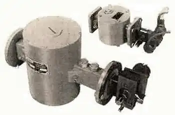 Deux cavités micro-ondes datant de 1955, chacune reliée par un guide d'ondes, à un klystron reflex (à gauche) et à un tube à vide (à droite) utilisés pour générer des micro-ondes. Les cavités servent de résonateurs (circuit bouchon ou réservoir ou en anglais : tank circuit) pour déterminer la fréquence des oscillateurs.