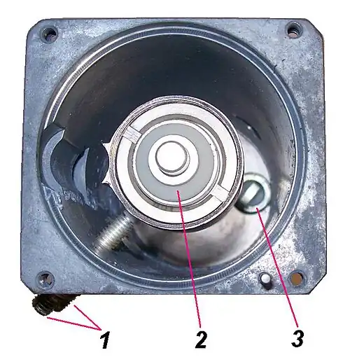 L’intérieur d’une cavité d’un émetteur radar militaire russe, avec le couvercle retiré. La cavité sert de circuit résonnant d’un oscillateur utilisant le tube à vide triode à l’intérieur. Pièces :