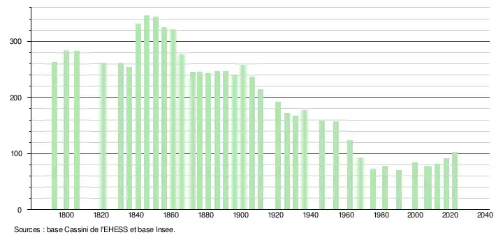 L'évolution du nombre d'habitants est connue à travers les recensements de la population effectués dans la commune depuis 1793. Pour les communes de moins de 10 000 habitants, une enquête de recensement portant sur toute la population est réalisée tous les cinq ans, les populations de référence des années intermédiaires étant quant à elles estimées par interpolation ou extrapolation[28]. Pour la commune, le premier recensement exhaustif entrant dans le cadre du nouveau dispositif a été réalisé en 2007[29].