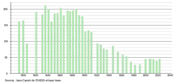 | L'évolution du nombre d'habitants est connue à travers les recensements de la population effectués dans la commune depuis 1793. Pour les communes de moins de 10 000 habitants, une enquête de recensement portant sur toute la population est réalisée tous les cinq ans, les populations de référence des années intermédiaires étant quant à elles estimées par interpolation ou extrapolation[39]. Pour la commune, le premier recensement exhaustif entrant dans le cadre du nouveau dispositif a été réalisé en 2007[40]. En 2022, la commune comptait 45 habitants[Note 5], en évolution de +7,14 % par rapport à 2016 (Ariège : +1,48 %, France hors Mayotte : +2,11 %). |
