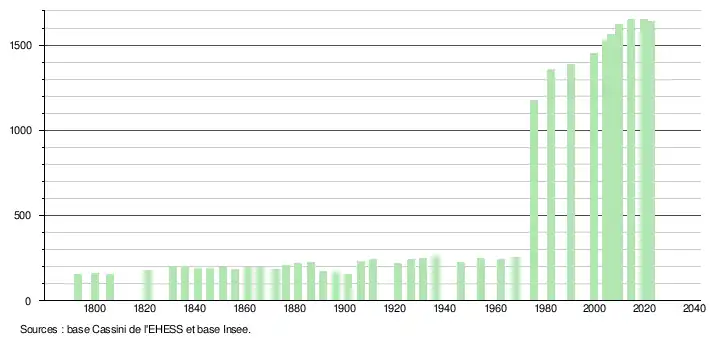 L'évolution du nombre d'habitants est connue à travers les recensements de la population effectués dans la commune depuis 1793. Pour les communes de moins de 10 000 habitants, une enquête de recensement portant sur toute la population est réalisée tous les cinq ans, les populations de référence des années intermédiaires étant quant à elles estimées par interpolation ou extrapolation[29]. Pour la commune, le premier recensement exhaustif entrant dans le cadre du nouveau dispositif a été réalisé en 2004[30].
