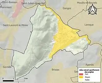 Le retrait-gonflement des sols argileux est susceptible d'engendrer des dommages importants aux bâtiments en cas d’alternance de périodes de sécheresse et de pluie. 22,7 % de la superficie communale est en aléa moyen ou fort (59,3 % au niveau départemental et 48,5 % au niveau national). Sur les 665 bâtiments dénombrés sur la commune en 2019, 525 sont en aléa moyen ou fort, soit 79 %, à comparer aux 85 % au niveau départemental et 54 % au niveau national. Une cartographie de l'exposition du territoire national au retrait gonflement des sols argileux est disponible sur le site du BRGM[21],[Carte 2].