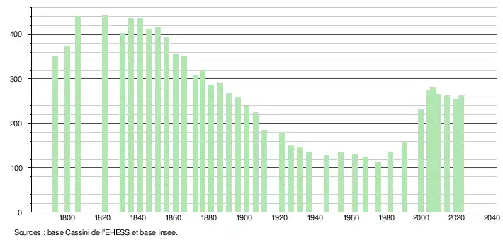 L'évolution du nombre d'habitants est connue à travers les recensements de la population effectués dans la commune depuis 1793. Pour les communes de moins de 10 000 habitants, une enquête de recensement portant sur toute la population est réalisée tous les cinq ans, les populations de référence des années intermédiaires étant quant à elles estimées par interpolation ou extrapolation[16]. Pour la commune, le premier recensement exhaustif entrant dans le cadre du nouveau dispositif a été réalisé en 2004[17].