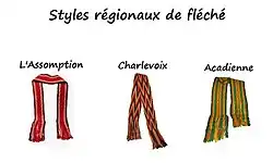 Des chansonniers, des danseurs de folklore et particulièrement Bonhomme Carnaval, ambassadeur de l'hiver arborant un modèle exclusif créé pour lui par Thérèse L. Bédard de Charlesbourg, mère d’une duchesse, ce modèle ressemblant au modèle dit de l'Assomption[12], contribuent grandement à faire connaître la ceinture fléchée aux visiteurs de divers pays, soit lors de spectacles au cours du Carnaval de Québec. Le fléché, tout en conservant la technique ancienne, sert maintenant de foulard, écharpe, signets, murales, etc. qui contribuent à sa survie.