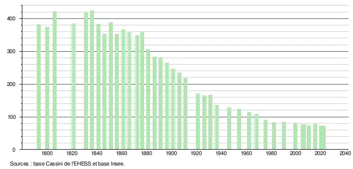 L'évolution du nombre d'habitants est connue à travers les recensements de la population effectués dans la commune depuis 1793. Pour les communes de moins de 10 000 habitants, une enquête de recensement portant sur toute la population est réalisée tous les cinq ans, les populations de référence des années intermédiaires étant quant à elles estimées par interpolation ou extrapolation[13]. Pour la commune, le premier recensement exhaustif entrant dans le cadre du nouveau dispositif a été réalisé en 2005[14].