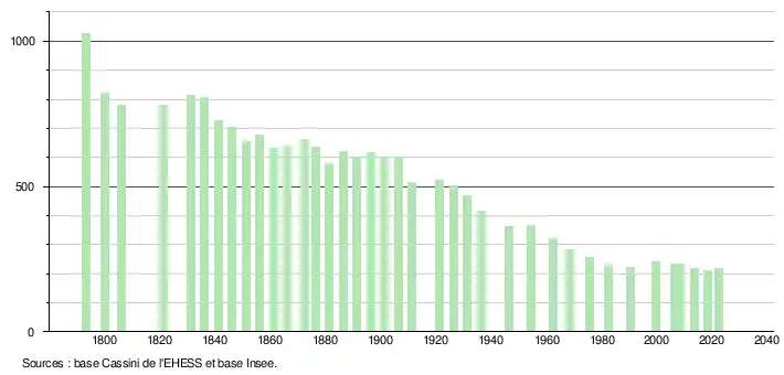 L'évolution du nombre d'habitants est connue à travers les recensements de la population effectués dans la commune depuis 1793. Pour les communes de moins de 10 000 habitants, une enquête de recensement portant sur toute la population est réalisée tous les cinq ans, les populations de référence des années intermédiaires étant quant à elles estimées par interpolation ou extrapolation[8]. Pour la commune, le premier recensement exhaustif entrant dans le cadre du nouveau dispositif a été réalisé en 2008[9].