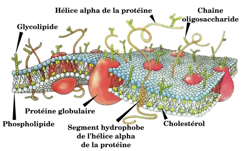 La membrane plasmique, ou membrane cellulaire, est une membrane biologique qui entoure et délimite le cytoplasme d'une cellule. Chez les animaux, la membrane matérialise la surface de la cellule, tandis que, chez les plantes et les procaryotes, elle est généralement recouverte d'une paroi cellulaire. Ainsi, chez les plantes, les algues et les mycètes, la cellule est incluse dans une paroi pectocellulosique, qui fournit un squelette à l'organisme[8]. Des dépôts de composés tels que la subérine ou la lignine modulent les propriétés physico-chimiques de la paroi, la rendant plus rigide ou plus imperméable, par exemple.