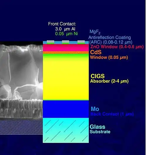 La structure de base d'une cellule solaire à couche mince CIGS (Cu(In,Ga)Se2) est représentée sur l'image de droite. Le substrat le plus commun est un verre de silicate sodocalcique de 1 à 3 mm d'épaisseur. Ce dernier est recouvert sur un côté de molybdène (Mo) servant de contact arrière métallique. L'hétérojonction est formée entre les semi-conducteurs CIGS et ZnO, avec une fine couche d'interface constituée de CdS et de ZnO. Le CIGS a un dopage de type p provenant de défauts intrinsèques, alors que le ZnO est de type n grâce à l'incorporation d'aluminium (Al). Ce dopage asymétrique est à l'origine de la région de charge d'espace qui s'étend davantage dans le CIGS que dans le ZnO. La couche de CIGS sert d'absorbeur avec une largeur de bande interdite comprise entre 1,02 eV (CuInSe2) et 1,65 eV (CuGaSe2). L'absorption est minimisée dans les couches supérieures, appelées fenêtres, par le choix de bandes interdites plus larges : 3,2 eV pour ZnO et 2,4 eV pour CdS. Le ZnO dopé sert également de contact supérieur pour collecter le courant. Les dispositifs expérimentaux, typiquement d'une surface de 0,5 cm2 présentent une grille de Ni/Al déposée sur la face avant pour réaliser le contact avec le ZnO.