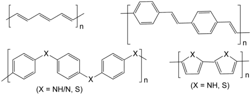 - Les molécules servant de donneurs d'électrons (par génération d'excitons, c'est-à-dire de paires électron-trou) sont caractérisées par la présence d'électrons π, généralement dans un polymère conjugué dit « de type n ».