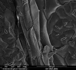 Observation de l'épiderme d'une feuille d'Arabidopsis thaliana par microscopie électronique à balayage cryogénisée (cryo-SEM). Remarquez les minuscules conidiospores de Hyaloperonospora parasitica.Micrographie électronique des cellules épidermiques d'un Brassica rapa , sous-espèce Feuille de chinensis. Les stomates sont également visibles.