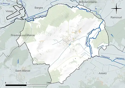 Les communes limitrophes sont Barges, Blondefontaine, Jussey, Raincourt, Rosières-sur-Mance et Saint-Marcel.