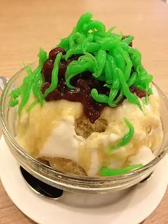 | Ingrédients | Nouilles de riz au pandan, lait de coco, sirop de palme, glace pilée. |