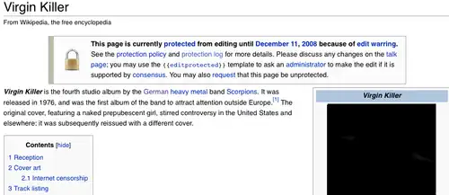 En , l'Internet Watch Foundation (IWF) ajoute l'article en anglais Virgin Killer, portant sur un disque du groupe Scorpions, sur sa liste noire à cause de la pochette du disque qui montre une fillette nue de face, ce qui contreviendrait aux lois sur la pédopornographie. L'image est catégorisée au plus faible niveau possible : « pose érotique sans activité à caractère sexuel[trad 6] »[61]. En conséquence, les internautes britanniques utilisant les services des FAI majeurs du Royaume-Uni sont interdits de consultation de l'article[61],[62],[63] et une partie significative des internautes du Royaume-Uni est interdite de modifier Wikipédia à cause de la méthode utilisée pour bloquer le contenu sensible. À la suite de discussions, de représentations par la Wikimedia Foundation (qui héberge Wikipédia)[64] et de plaintes du public[65], l'IWF annule sa décision trois jours plus tard.