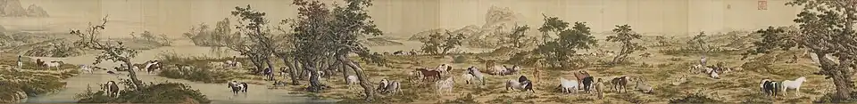 La peinture mesure 94,5 cm de haut pour 7,76 mètres de long, soit un format habituel pour son époque[1]. Elle représente un grand nombre de chevaux aux postures variées, dans des paysages de rivières délimités à l'horizon par des montagnes, de façon ininterrompue[2],[1].