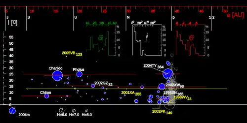 - ↑ Le diamètre est connu pour quelques centaures seulement ; les estimations, fondées sur l'albédo présumé, sont utilisées pour tous les autres à titre d’illustration.
