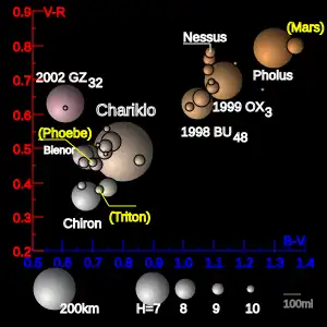 L'indice de couleur est la mesure des différences de magnitude apparente de l’objet vu à travers des filtres bleu (B), neutre (V ; vert-jaune) et rouge (R). Le graphe représente les indices connus des transneptuniens à l’exception des plus grands[12].