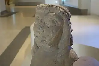 La tête, détaillée, à la barbe incisée et aux cheveux en trois tresses descendant sur le haut des jambes, laisse place à un torse sommaire ainsi qu'au corps chevalin dont il manque la queue. Les bras manquent, ainsi que les jambes au-dessous des genoux ; les mains sont visibles sur les hanches [2].