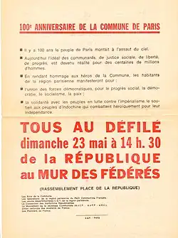 Les différents mouvements révolutionnaires (socialiste, communiste, anarchiste) transforment eux la Commune en une « aurore » des révolutions à venir. Durant le XXe siècle, sa mémoire est accaparée par le Parti communiste français qui l'utilise pour sa propagande pro-soviétique puis lors du Front populaire[2]. Les mouvements de gauche commémorent régulièrement la Commune de Paris, notamment durant le mois de mai avec une manifestation en direction du mur des Fédérés, monument en hommage aux communards et communardes situés dans le cimetière du Père-Lachaise, un des derniers lieux des affrontements en 1871. La manifestation devient annuelle à partir de 1908 et se transforme dans le même temps en manifestation politique. Les conflits fratricides des partis empêchent l'organisation de défilés communs et, à partir de 1921, le Parti communiste français (PCF) et la Section française de l'Internationale ouvrière (SFIO) ne défilent plus le même jour. Après 1947, les plus importantes mobilisations, qui s'étaient notamment fait remarquer lors des manifestations unitaires de 1935 et 1936 et de la Libération, ne sont plus qu'occasionnelles[3]. Les divisions politiques et l'affaiblissement de la classe ouvrière parisienne ont amoindri la capacité mobilisatrice du Mur[4].