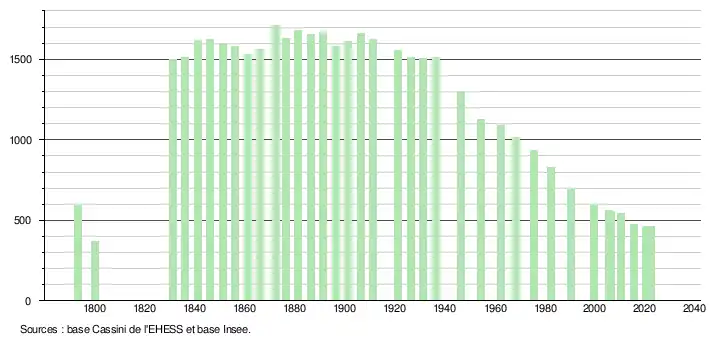 L'évolution du nombre d'habitants est connue à travers les recensements de la population effectués dans la commune depuis 1793. Pour les communes de moins de 10 000 habitants, une enquête de recensement portant sur toute la population est réalisée tous les cinq ans, les populations de référence des années intermédiaires étant quant à elles estimées par interpolation ou extrapolation[49]. Pour la commune, le premier recensement exhaustif entrant dans le cadre du nouveau dispositif a été réalisé en 2005[50].