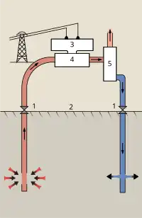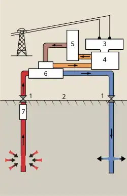La production d'électricité nécessite des ressources à haute température qui ne peuvent venir que des grandes profondeurs. La chaleur doit être transportée vers la surface par la circulation d'un fluide, à travers des conduits de magma, des sources chaudes, la circulation hydrothermale, des puits de pétrole, des forages d'eau, ou une combinaison de ces voies. Cette circulation existe parfois naturellement là où la croûte est fine : les conduits magmatiques apportent la chaleur près de la surface, et les sources chaudes l'apportent directement à la surface. Si aucune source chaude n'est disponible, un puits peut être creusé dans un aquifère chaud. Loin des bords des plaques tectoniques, le gradient géothermique est de 25 à 30 °C par kilomètre de profondeur sur la majeure partie de la planète, et les puits devraient être profonds de plusieurs kilomètres pour permettre la production d'électricité[7]. La quantité et la qualité de ressources récupérables augmentent avec la profondeur de forage et avec la proximité des bords des plaques tectoniques.
