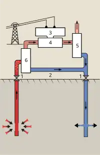 Les centrales électriques géothermiques ont été jusqu'à récemment construites exclusivement là où des ressources géothermiques à haute température sont disponibles près de la surface. Le développement de la centrale à cycle combiné et des améliorations dans les forages et la technologie d'extraction peuvent permettre des EGS (enhanced geothermal systems - systèmes géothermiques stimulés) sur une aire géographique beaucoup plus étendue[8]. Des projets de démonstration sont opérationnels à Landau in der Pfalz en Allemagne et Soultz-sous-Forêts en France, alors qu'une tentative antérieure à Bâle en Suisse fut abandonnée après qu'elle eut déclenché des tremblements de terre (séisme induit). D'autres projets de démonstration sont en construction en Australie, au Royaume-Uni et aux États-Unis[9].