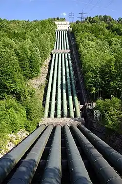 Six aqueducs de 430 m de longueur avec un diamètre qui diminue légèrement vers l'aval 2 m, distribuent l'eau vers les huit turbines de la chambre des machines. Le diamètre de ces conduites va diminuant, de 2,25 m en haut à 1,85 m au niveau de la salle des machines. L'épaisseur augmente au contraire de 10 mm à 27 mm. La salle des machines, longue de plus de 100 m, est décalée par rapport à l'axe des conduites pour évitée qu'elle soit sinistrée en cas de rupture d'une conduite.