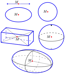 Dans l'espace, on trouve les sphères et les boules (associées à une norme), les parallélépipèdes, les quadriques à centre.