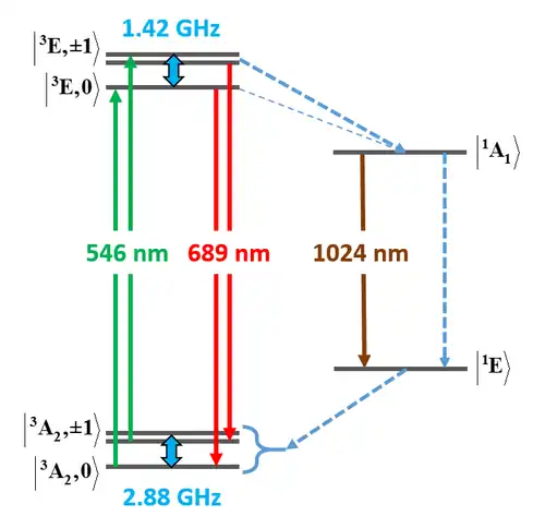 En considérant le centre NV− comme un système à plusieurs électrons, il est possible de le représenter par le diagramme ci-dessus, dans lequel les états sont indiqués par leur symétrie avec un exposant gauche valant 3 pour indiquer un état triplet (S = 1) et valant 1 pour indiquer un état singulet (S = 0). Il est bien admis aujourd'hui qu'on est en présence de deux états triplet et de deux états singulet intermédiaires[33].