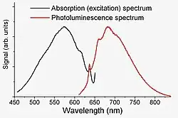 Les centres NV− émettent une forte lumière rouge lorsqu'ils sont excités par des sources de lumière visible, comme des lasers à ions d'argon ou de krypton (en), des lasers Nd:YAG à doublement de fréquence, des lasers à colorants ou des lasers He-Ne. Il est également possible de les exciter à des énergies inférieures à celle de zéro émission de phonons[16]. L'illumination par laser convertit également certains centres NV− en centres NV0[4]. L'émission est très rapide, avec un temps de relaxation de l'ordre de 10 ns[17],[18]. L'élargissement thermique fait que les raies observées sont très diffuses, mais leur netteté s'améliore considérablement en refroidissant les centres NV− à l'azote liquide, voire à l'hélium liquide, ce qui permet de ramener leur largeur à quelques mégahertz.