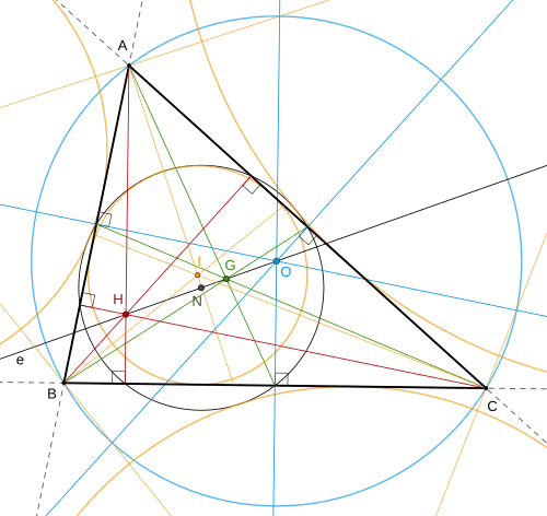 | X8 | Point de Nagel | Na | Point d'intersection des droites reliant les sommets et les points de contact des cercles exinscrits aux côtés opposés. | ||