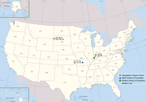 - ↑ (en) « Position of the Geographic Center of Area, Mean and Median Centers of Population: 2010 »(Archive.org • Wikiwix • Archive.is • Google • Que faire ?) [PDF].