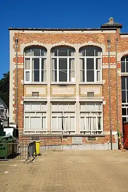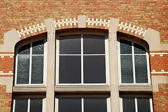 La partie droite de la façade nord-ouest, en retrait, est percée de trois baies tripartites monumentales, couvrant le rez-de-chaussée et l'étage. Compartimentées par des meneaux et des traverses de pierre, ces baies sont également sommées d'arcs surbaissés réalisés en briques blanches et orange alternées, avec clé, claveaux et sommiers en pierre de taille. Cette portion de façade est surmontée de quatre forts pinacles de style Art nouveau géométrique.