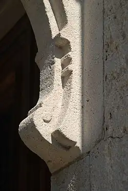Les hautes fenêtres rectangulaires de l'étage possèdent un meneau de pierre qui supporte un linteau orné d'une petite frise de denticules.