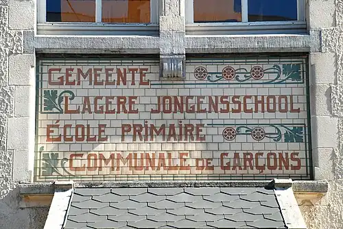 Au-dessus de l'auvent, une plaque de carreaux de céramique ornée de motifs floraux affiche « Gemeente lagere jongensschool - École primaire communale de garçons ».