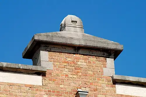Le seul ornement de cette façade consiste en une belle porte d'entrée surmontée d'un auvent supporté par deux consoles à la décoration typique de l'Art nouveau géométrique.