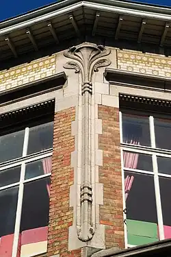 Cette façade de droite se termine par un étage complètement asymétrique constitué d'un pan parallèle à la rue et d'un pan oblique précédé d'un balcon à balustrade de pierre de bleue et fers forgés Art nouveau. Ces deux pans de mur sont séparés sur l'angle par un magnifique ornement sculpté en forme de colonne fasciculée terminée par un fleuron Art nouveau, motif ornemental particulièrement apprécié par Henri Jacobs.