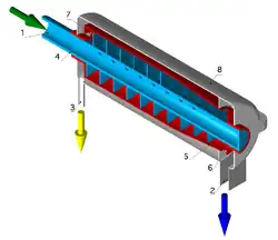 Sur la figure ci-contre, la carcasse de l'appareil est stationnaire et solidaire avec la base de celui-ci. Le collecteur de boues 1/4 et le rotor 5 tournent, ce qui permet aux particules solides, ayant une densité élevée, de se déposer sur la surface interne du rotor 5 à des vitesses différentes. Cela permet également un mouvement axial du solide qui est donc entrainé par la vis sans fin vers les ouvertures 6, d'où le solide est projeté vers la sortie 2. La fraction liquide se déverse par les ouvertures 7 et est également éliminée vers la sortie 3.