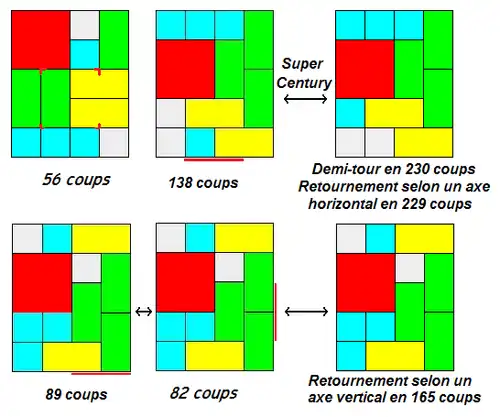 Le jeu Century correspond à un placement inclus dans la composante connexe principale. Il peut donc être retourné selon un axe horizontal ou par un demi-tour. Le retournement selon un axe vertical n'a pas de sens (se fait en 0 coup) puisque ce placement possède lui-même un axe de symétrie vertical. Le plus long chemin à partir de ce placement mesure 188 coups. On peut amener le grand carré au milieu du côté du bas en 99 coups et effectuer le retournement selon un axe horizontal en 149 coups, 148 si on veut faire un demi-tour (ce qui amène à 150 si on veut placer le rectangle du centre à sa place, entre-deux positions). Il faut seulement 52 coups pour mener ce carré dans un des coins opposés, 48 pour l'amener en bas d'un des côtés et 43 pour l'amener en bas, au centre.