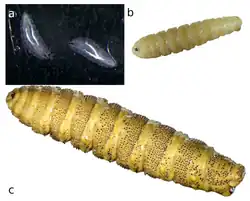 La larve de C. stimulator est allongée et comporte douze segments, la région ventrale étant plus plate que la région dorsale. La tête est mobile et peut être rétractée dans le thorax. Le corps est couvert d'épines qui, avec les grands crochets buccaux, servent à s'accrocher à la muqueuse de l'hôte, évitant ainsi à la larve d'être expulsée par les mécanismes de défense, tels que la toux et les éternuements. Trois stades de développement sont distingués : au premier, la larve est blanche et mesure plus ou moins 2,27 mm de long ; au deuxième, elle est jaunâtre, présente une densité d'épines plus faible et sa longueur varie entre 3 et 13 mm ; au troisième, elle s’assombrit, mesure plus ou moins 25 mm de long et présente de nombreuses cellules adipeuses sur les flancs et le dos de l'abdomen[1].