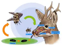 La femelle fécondée dépose ou projette des paquets de 30 à 50 larves de premier stade dans les narines de différents spécimens de chevreuils qu'elle aura détecté par leur odeur ou par le CO2 exhalé. Au cours de sa courte vie de 16 jours, elle produit jusqu'à 500 larves entourées d'un liquide gélatineux épais qui favorise leur adhésion à leur hôte et les protège de la dessiccation[1].