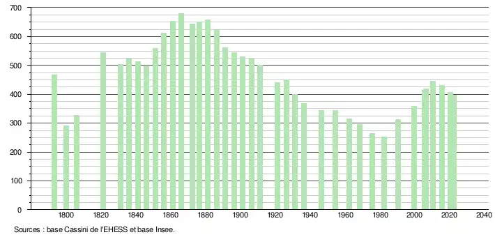 L'évolution du nombre d'habitants est connue à travers les recensements de la population effectués dans la commune depuis 1793. Pour les communes de moins de 10 000 habitants, une enquête de recensement portant sur toute la population est réalisée tous les cinq ans, les populations de référence des années intermédiaires étant quant à elles estimées par interpolation ou extrapolation[24]. Pour la commune, le premier recensement exhaustif entrant dans le cadre du nouveau dispositif a été réalisé en 2005[25].