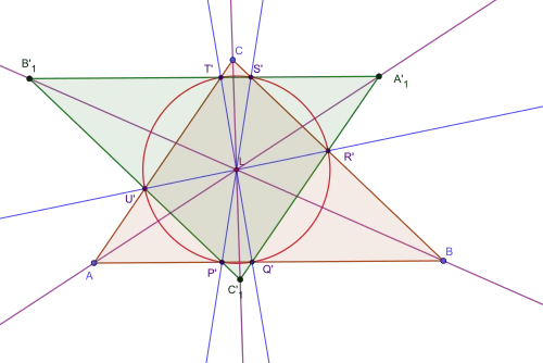 Ils forment un triangle A’1B’1C’1 symétrique de ABC dans une symétrie de centre L. Par la même symétrie, les triangles P'R'T' et Q'S'U' sont symétriques.