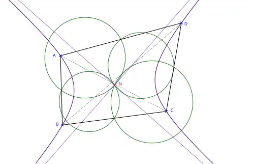 Le point d'Euler-Poncelet se trouve sur les quatre cercles podaires de ABCD issus de chacun des sommets[13].