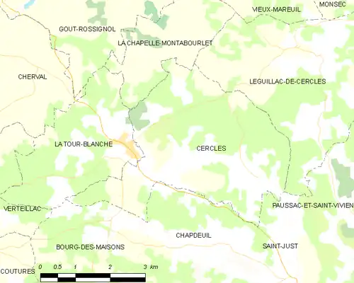 En 2016, année précédant la création de la commune nouvelle de La Tour-Blanche-Cercles, Cercles était limitrophe de six autres communes. À l'est, le territoire de Paussac-et-Saint-Vivien était distant d'environ 600 mètres.