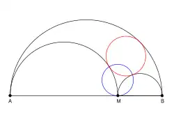 On considère un arbelos formé par un demi-cercle de diamètre [AB] , et deux demi-cercles de diamètres [AM] et [MB] (M étant un point du segment [AB]).