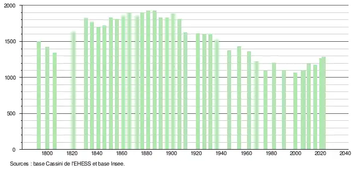 L'évolution du nombre d'habitants est connue à travers les recensements de la population effectués dans la commune depuis 1793. Pour les communes de moins de 10 000 habitants, une enquête de recensement portant sur toute la population est réalisée tous les cinq ans, les populations de référence des années intermédiaires étant quant à elles estimées par interpolation ou extrapolation[22]. Pour la commune, le premier recensement exhaustif entrant dans le cadre du nouveau dispositif a été réalisé en 2005[23].