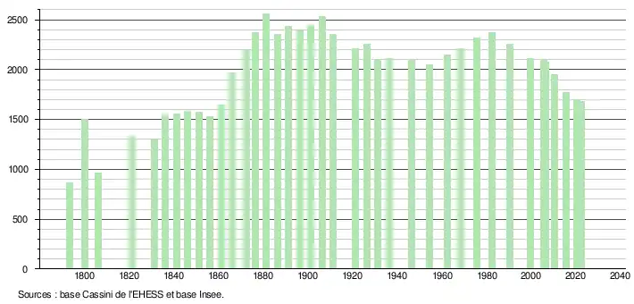 L'évolution du nombre d'habitants est connue à travers les recensements de la population effectués dans la commune depuis 1793. Pour les communes de moins de 10 000 habitants, une enquête de recensement portant sur toute la population est réalisée tous les cinq ans, les populations de référence des années intermédiaires étant quant à elles estimées par interpolation ou extrapolation[15]. Pour la commune, le premier recensement exhaustif entrant dans le cadre du nouveau dispositif a été réalisé en 2005[16].