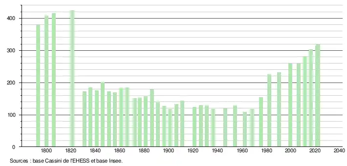 L'évolution du nombre d'habitants est connue à travers les recensements de la population effectués dans la commune depuis 1793. Pour les communes de moins de 10 000 habitants, une enquête de recensement portant sur toute la population est réalisée tous les cinq ans, les populations de référence des années intermédiaires étant quant à elles estimées par interpolation ou extrapolation[17]. Pour la commune, le premier recensement exhaustif entrant dans le cadre du nouveau dispositif a été réalisé en 2006[18].