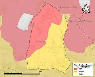 Les mouvements de terrains susceptibles de se produire sur la commune sont des tassements différentiels[19]. Le retrait-gonflement des sols argileux est susceptible d'engendrer des dommages importants aux bâtiments en cas d’alternance de périodes de sécheresse et de pluie[20]. La totalité de la commune est en aléa moyen ou fort (79,5 % au niveau départemental et 48,5 % au niveau national)[Carte 2]. Depuis le , en application de la loi ÉLAN, différentes contraintes s'imposent aux vendeurs, maîtres d'ouvrages ou constructeurs de biens situés dans une zone classée en aléa moyen ou fort[Note 2],[21].